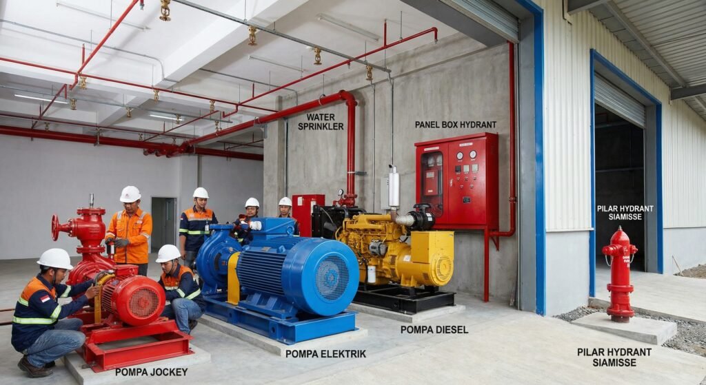Pemasangan Pompa Jockey , Pompa Elektrik , Pompa Diesel , Water Springkler , Deluge Sistem , Panel box Hydrant , Pilar Hydrant Siamisse, Dll