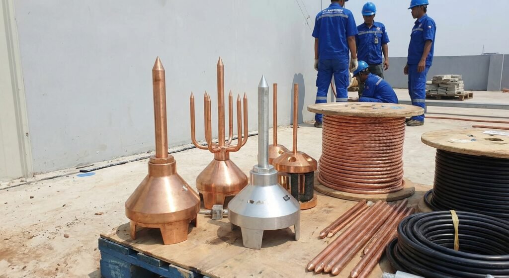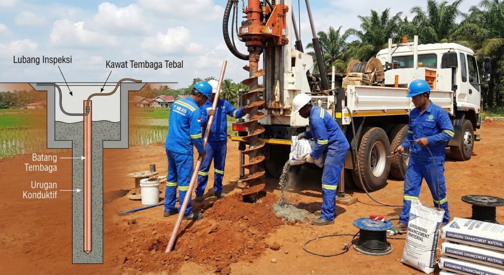 Grounding menyalurkan arus petir dan induksi ke tanah untuk melindungi peralatan. Metodenya memakai copper rod, plat atau pita tembaga. PT AHPINDO berpengalaman memasang sistem grounding di berbagai kondisi lokasi.