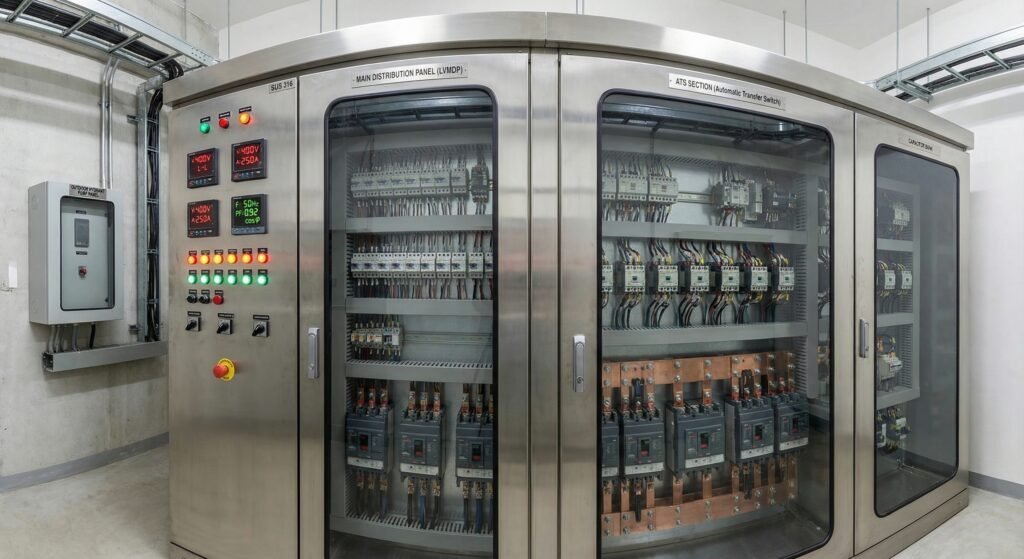 Instalasi ATS, AMF, Capacitor Bank, MDP, PDP, panel kontrol pompa, dan sistem distribusi listrik